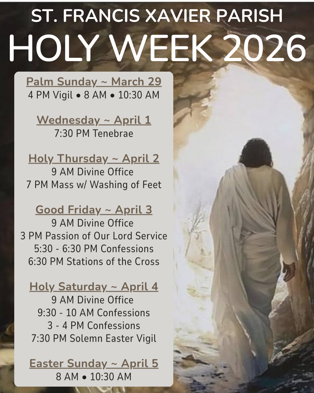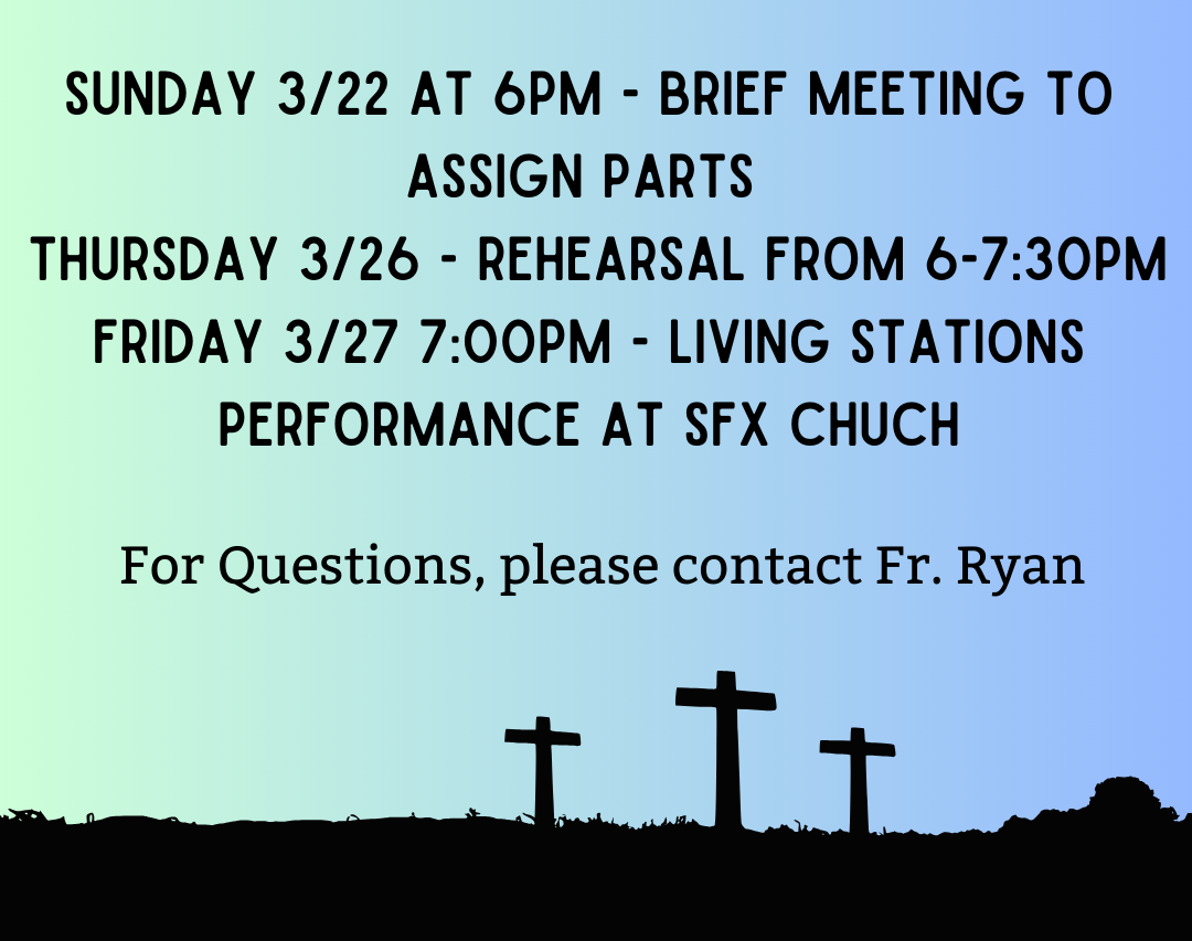 **Please note that Stations of the Cross this Friday, March 20, will be at 6:00pm rather than the usual 6:30pm due to the chowder and trivia night taking place in the school gym.