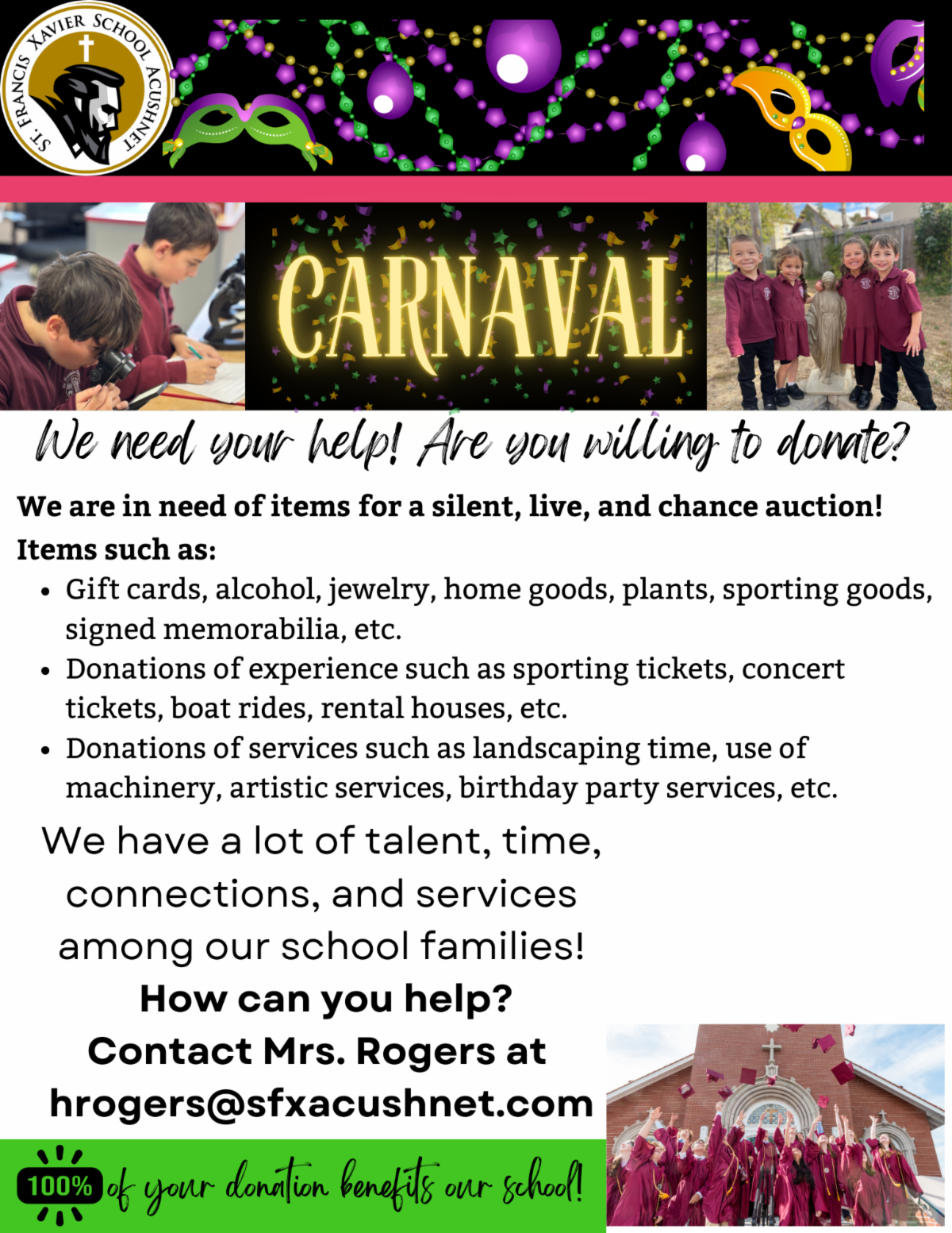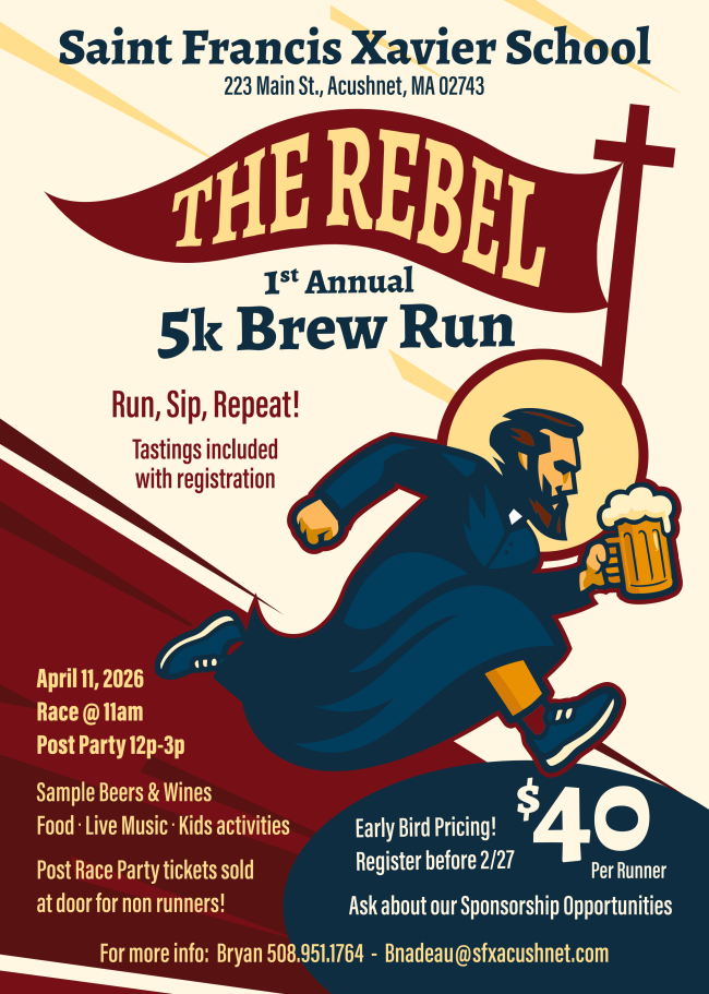 And finally, a reminder to see below for ways you can help with our upcoming School Benefit Banquet and info about our upcoming SFX School 5k Brew Run.